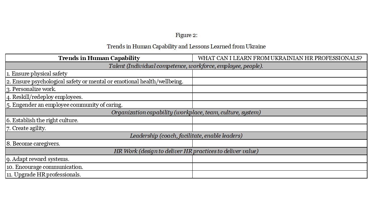 The future of HR exists today. As noted, we see many trends in human capability, and our Ukrainian colleagues facing daunting challenges are innovating and responding with creative actions. May we support one another and learn together.